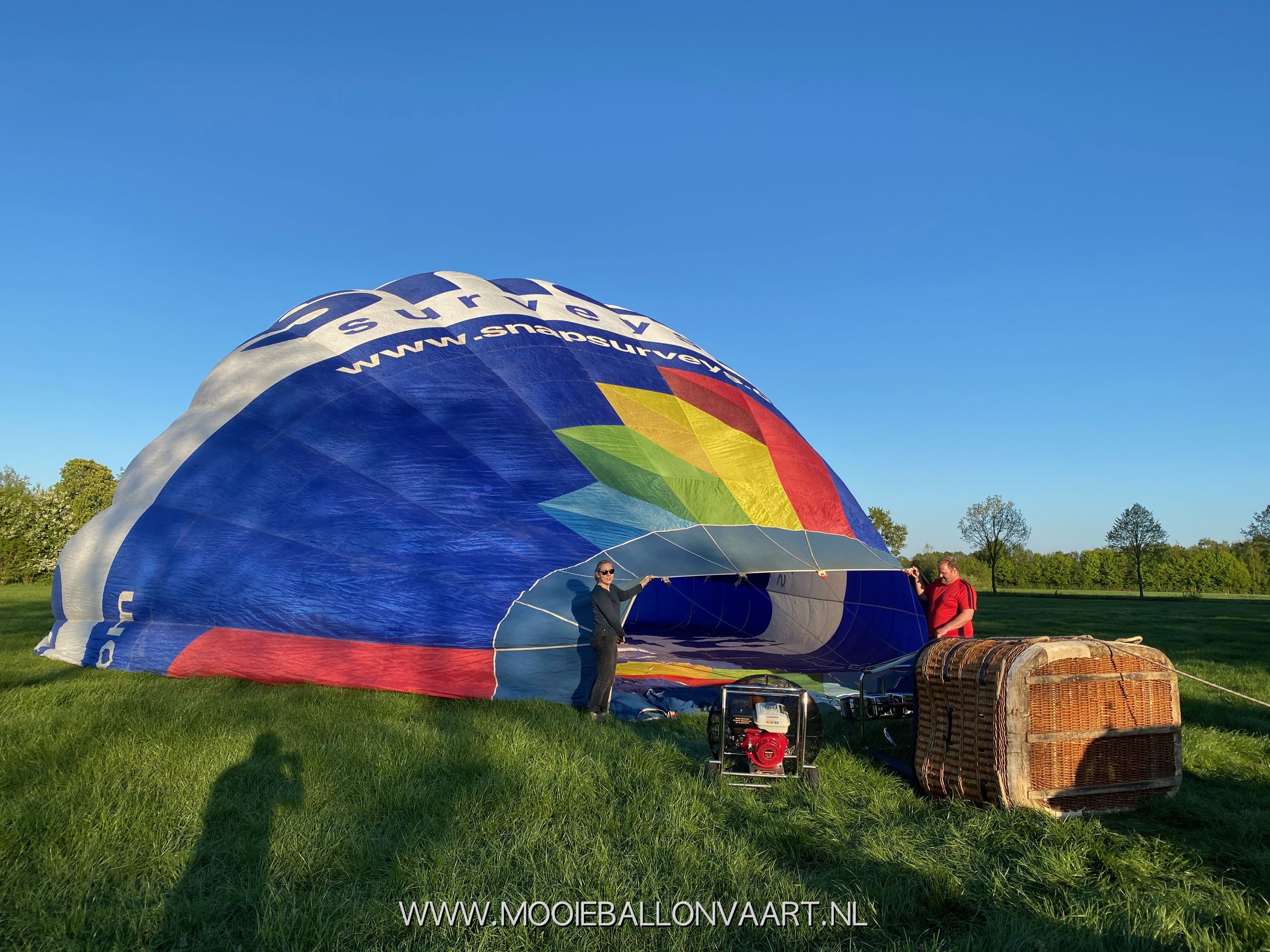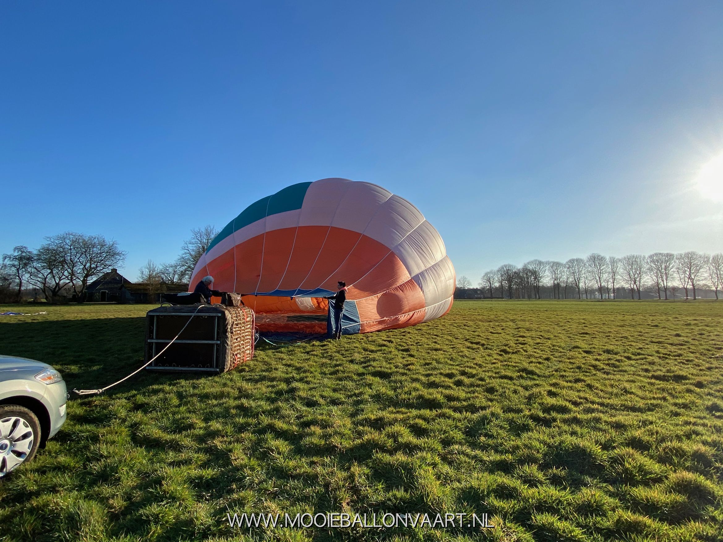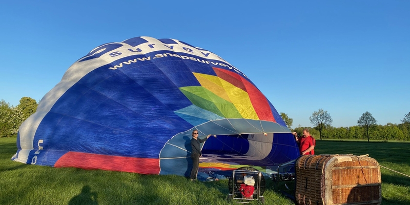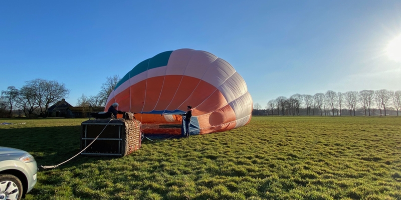 Voor de ballonvaart verwelkomen wij u op het veld. Daar kijken wij met welke windrichting wij te maken hebben en leggen we de luchtballon uit in de richting waar we naar toe gaan. De piloot en de crew koppelen de ballon vast aan de mand en vervolgens trekken wij de ballonstof uit de zak. Wij trekken de stof vervolgens uit elkaar waardoor er gemakkelijk lucht in de ballon geblazen kan worden. De luchtballon wordt door middel van een touw verankerd aan de volgauto. Hiermee voorkomen we dat de ballon bij een windvlaag vertrekt zonder dat iedereen aan boord is. Voordat we de ballon gaan vullen met lucht volgt er eerst een briefing en de veiligheidsinstructies.