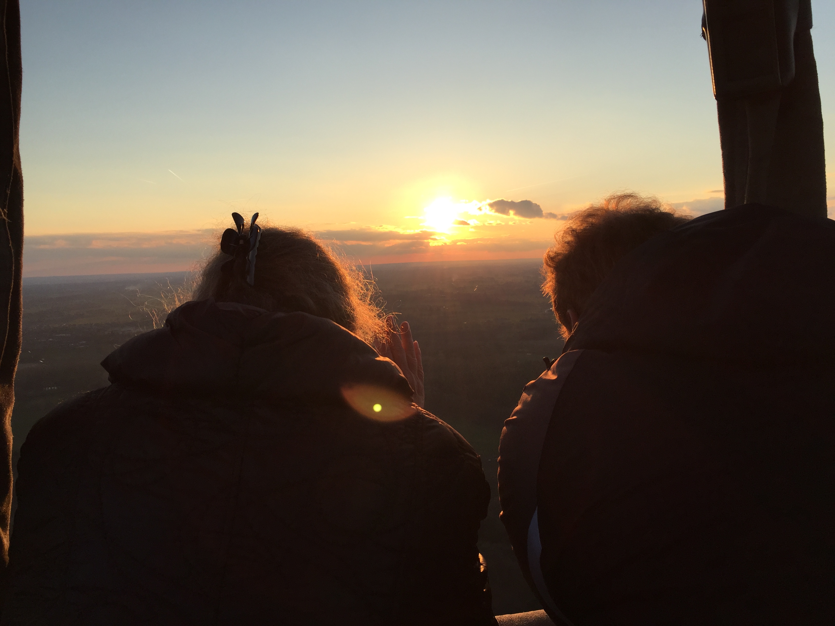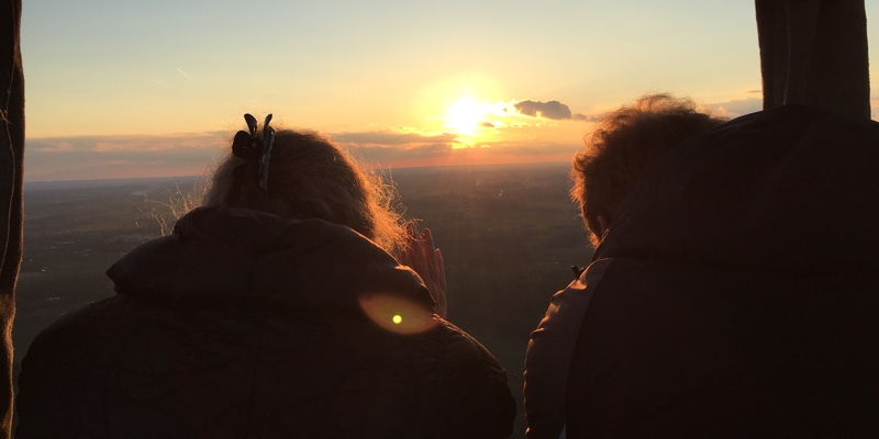 Eenmaal in de lucht is het gemiddeld een uur lang genieten van alles wat u dan meemaakt. Het is in de lucht zo stil en je ziet stukken natuur die je vanaf de grond niet gezien zou hebben. Het is niet uitgesloten dat u hazen, herten en andere wilde dieren ziet lopen. Mensen op de grond schreeuwen en zwaaien vaak naar de overkomende luchtballon. De ondergaande zon bepaalt hoe lang we in de lucht kunnen blijven en voor het donker gaan we op zoek naar een geschikte landingsplek. Hiermee houden we rekening met het aanwezige vee en de staat van het veld waar we willen landen, zodat we er gemakkelijk bij kunnen met onze volgauto.